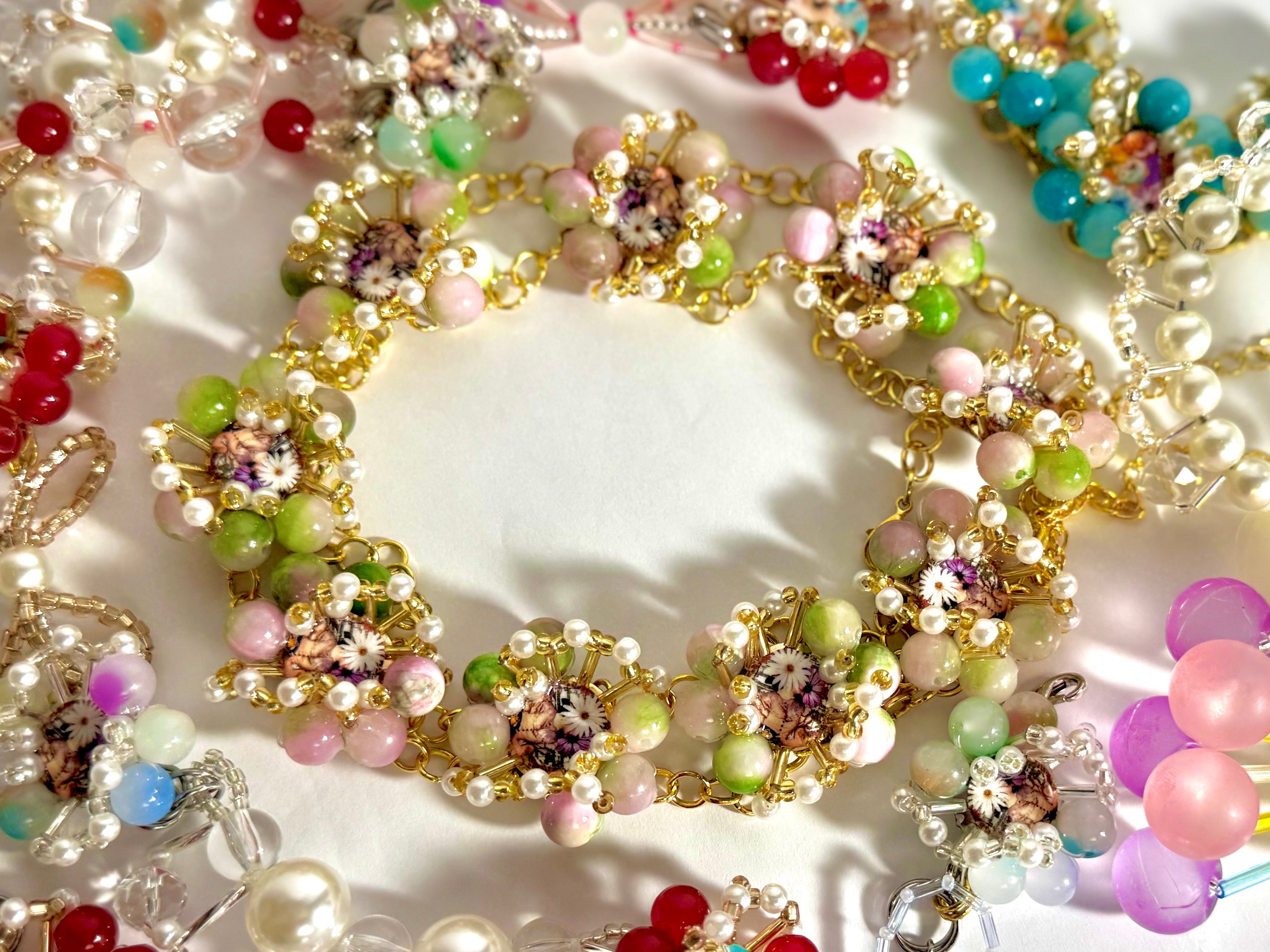ついに出会ってしまった。。。 ビーズと毛糸のマリアージュ。 流行りのニットを どうやったらビーズと馴染むかを 半年くらいひたすら考えていました。 フリル部分をビーズで縁取りし、 その縁取りビーズを 更にビーズで縁取った とっても豪華で繊細で 可愛らしい作品が完成しました。 まずはネックレスシリーズからのお届けです。 サイズ 全長:約70cm(アジャスター部分含む) フリル:約5cm 首周り:約50cm ※ネックレスに使用している 丸カンやカニカン、アジャスターは アレルギーに対応しておりません。 あらかじめご了承くださいませ。 ※他注意点は商品ページトップの "ご購入を検討中のすべてのお客様へ"にてご確認をお願い致します。